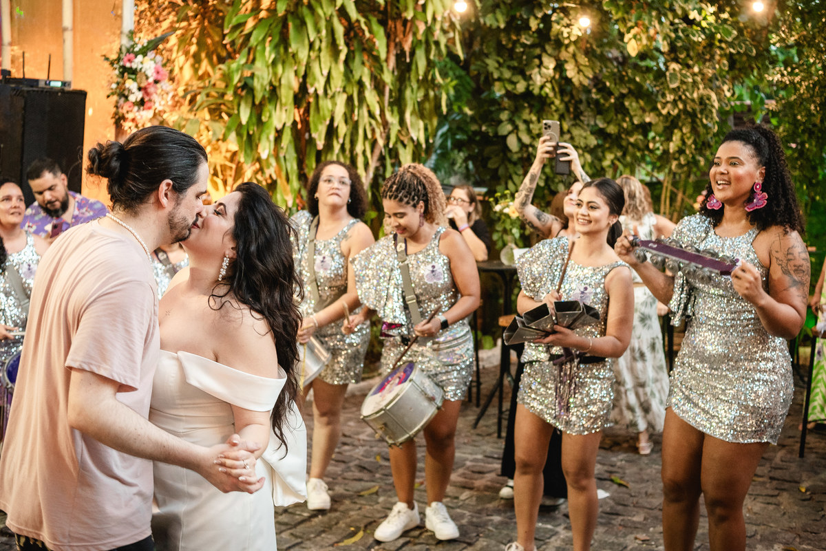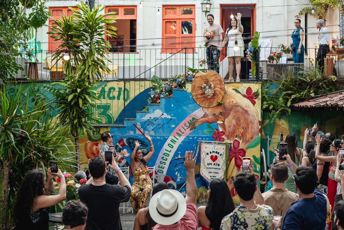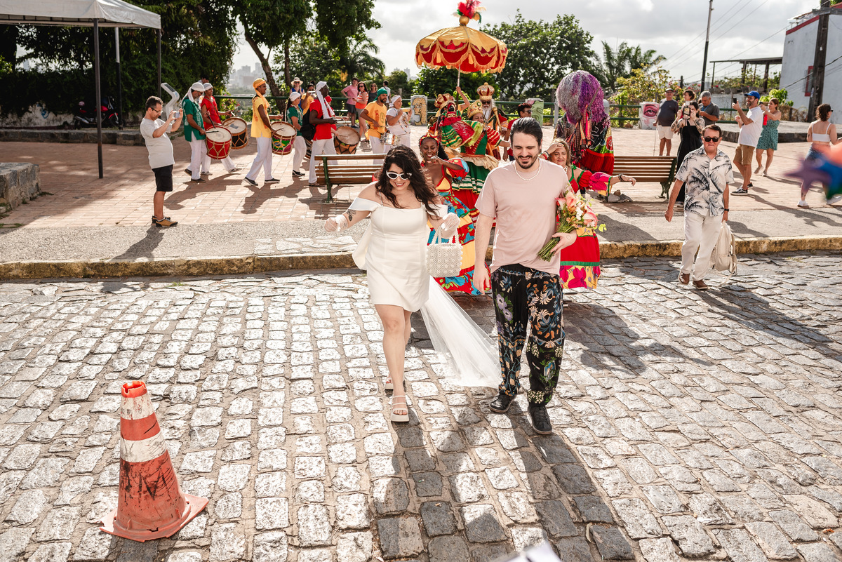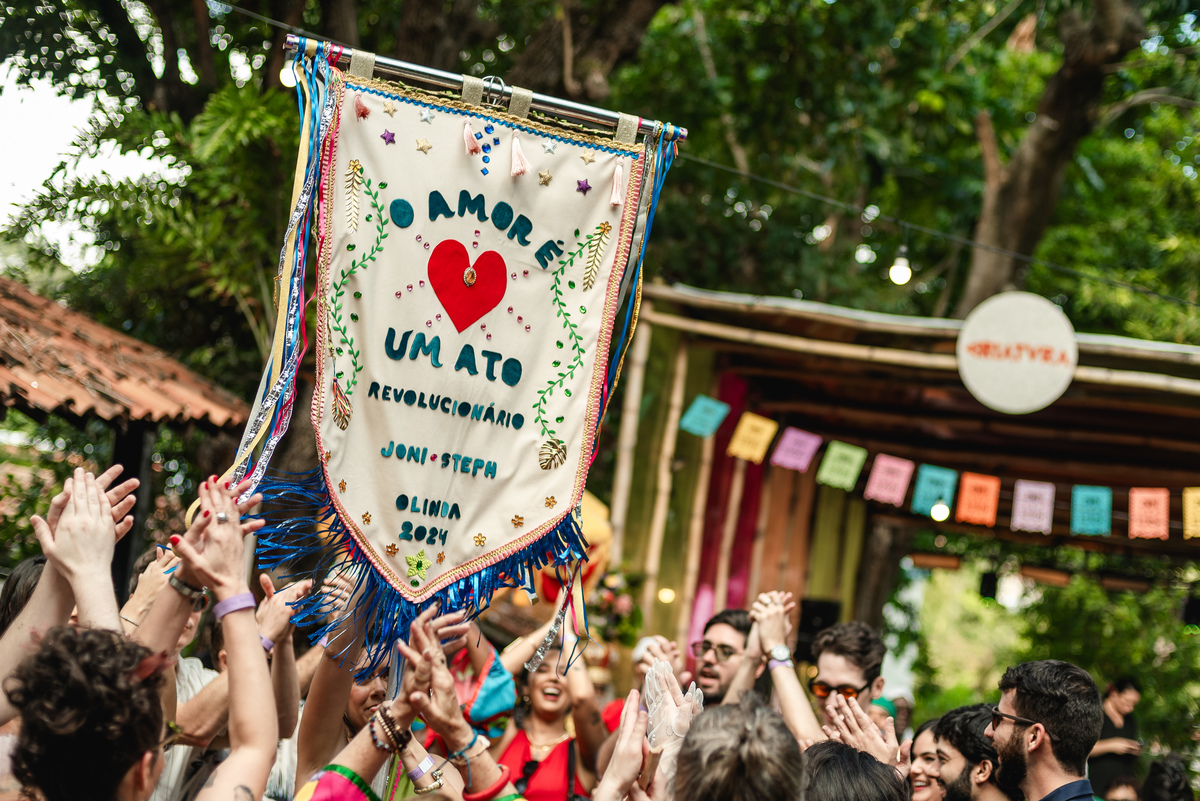Steph nasceu aqui e é ilustradora, ela ilustrou um cordel customizado com a história deles, painel de boas-vindas, programaçäo da festa e plaquinhas. Teve estandarte customizado, bandeirinhas da artista local Catarina Dee Jah. Uma mesa repleta de glitter, som de maracatu, dançarinos(as) de frevo e bonecos gigantes pra viver Olinda da forma mais massa possível.